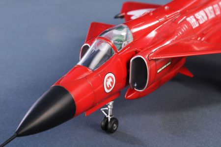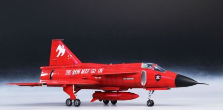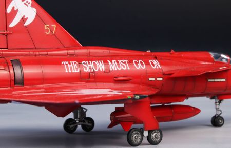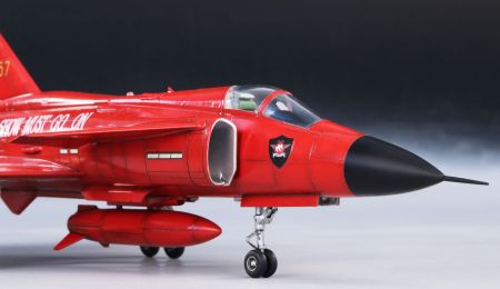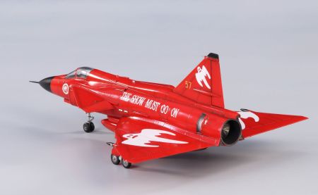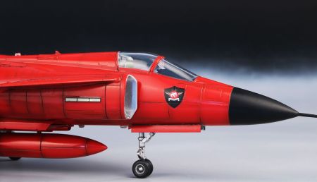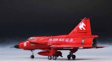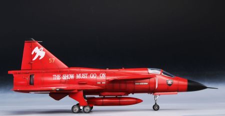 The Saab 37 Viggen was an aircraft ahead of its time. Its designers used an unorthodox construction which enabled the plane to meet all requirements laid om it and in some parameters even surpass these. The Swedish Air Force placed order for several versions of the Viggen, its basic design formed an universal platform which, using specialised equipment, enabled the plane to be used for various roles. The aircraft was powered by a Volvo RM8 turbofan, licence-built varian of the Pratt and Whitney JT8D with added afterburner and thrust-reverser unit, which in additio to the double-delta wing design enhanced the aircraft's performance on take offs and landings on short airstrips. For better handling with the Viggen on makeshift airfields, while towing them to their hangars or even to conceal them easily, the fin could be folded. At the time, the avionics used in the Viggen was among the best in the world and the VIggen was also the very first aircraft with avionics equipped with integrated circuits. At first, the Swedish military received the AJ 37 version, gradually followed by the SK 37 two seat trainer, SF 37 – reconnaissance aircraft with cameras in the modified nose section, the SH 37 anti-shipping version with different avionics and able to carry air-to-sea armament. About ten years after the first Viggens had entered the service, the second generation airframes followed in the form of the JA 37 fighter. The first of Viggens to serve in the ground attack role was the AJ 37 Viggen, later modified to the AJS 37 Viggen. One of these was painted in red overall anniversary scheme, plenty of white spook figures and was named “Show Must Go On”. This highly attractive plane is now depicted in our latest Viggen release.