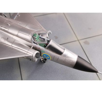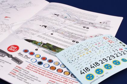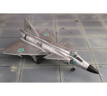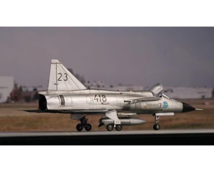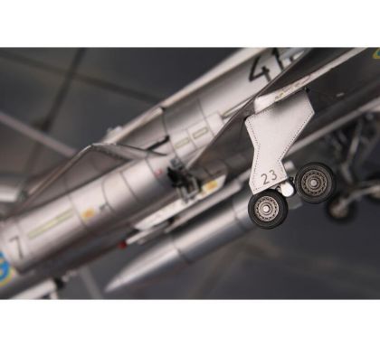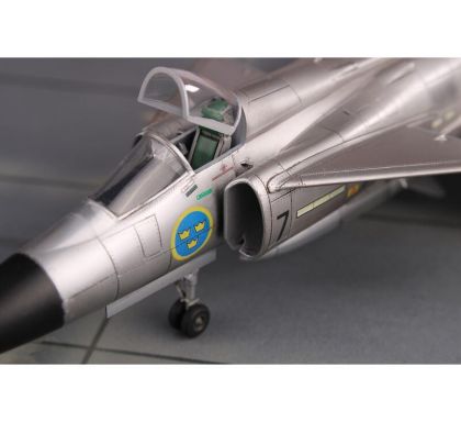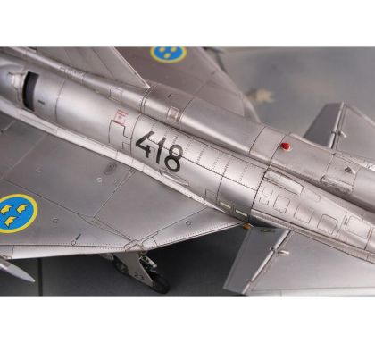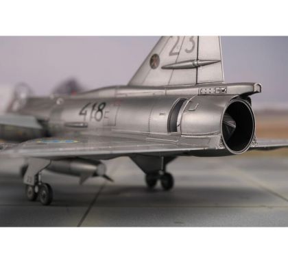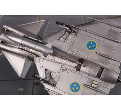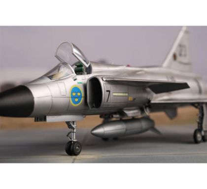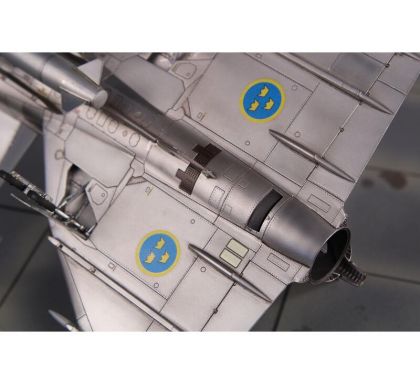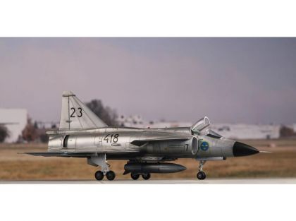 Our model portrays the initial production version, the ground-attack AJ37 Viggen. The kit comes on nine styrene sprues, the decal sheet with a very wide range of servicing stencils brings markings for three Swedish schemes, one of which is in bare metal, the other two in the typical Swedish splinter-type camouflage.