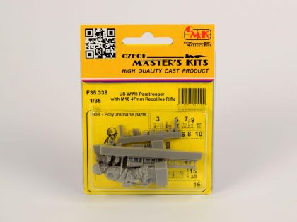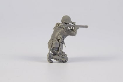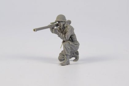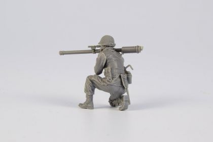 US Army soldier in winter clothing, kneeling and holding an M18 Bazooka. The weapon comes is a separate item comprising several parts. The arms of the figure are also separate parts.