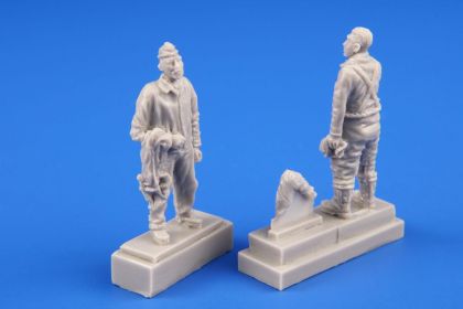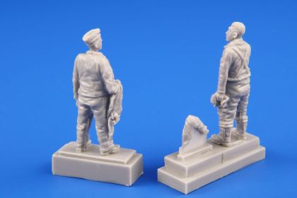 A figure of the German ace fighter pilot and his mechanic. Galland, wearing ex-RAF leather flying trousers has just left the cockpit of his mount and hands his life jacket over to the ground crew. He has lit up his cigare and it seems as if he is giving some important instructions to the mechanic. Galland’s arm and the cigar are a separate cast item.