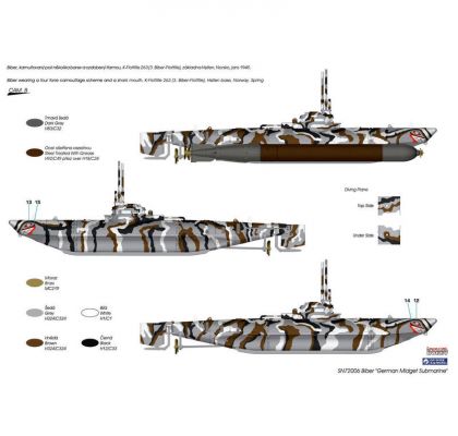 Bibers were put into so-called K-flottillen numbered 1 to 9, which saw action in the English Channel during the Allied invasion, in the North Sea off Norway, in the Scheldt estuary and also in the river Waal during the attack on the Nijmegen bridge. Bibers did not enjoy much success in the torpedo-carrying role, mine-laying missions suited them better. Some trouble also occured due to the exhaust fumes getting into the operator’s station and many Bibers were lost just to this reason. The conning tower lacked in height causing the submarine pilot, who was equipped only with wrist compass, difficulties in finding his way to the target. Moreover, the Biber although being rather manoeuvrable and stable on the surface, was clumsy while under the water. Several Biber submarines were captured during the war, but the Allies did not seem to find interest in them and tested them only very briefly. Some of the surviving machines have been put to display in museums.