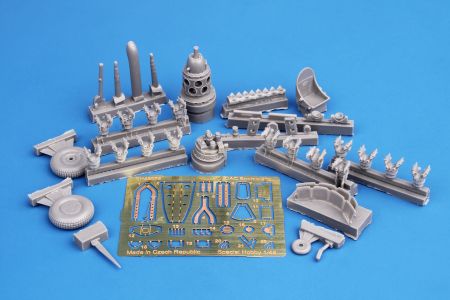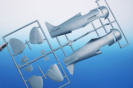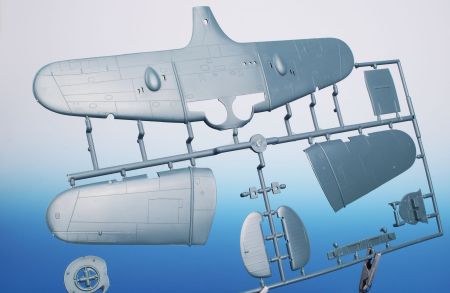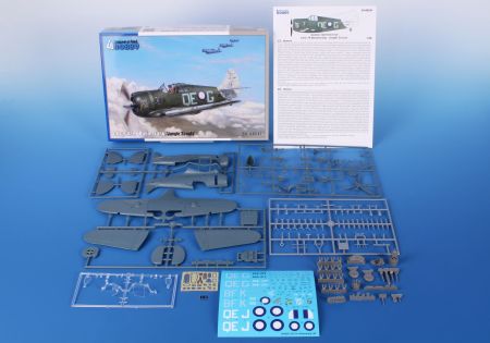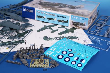The instruction sheet and decals enable the modeller to choose one of three green-overall machines two of which had their tail sections painted in white. All three of them carry some sort of nose art. The kit set itself comes on four grey styrene sprues, one with clear parts, a set of resin parts and a fret of etches.