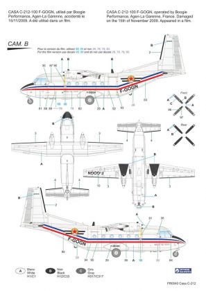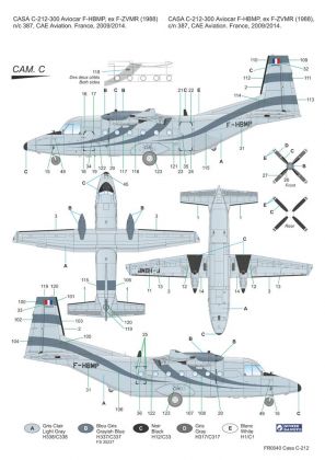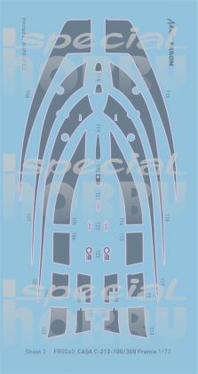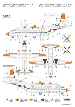 This model brings the CASA C-212 in -100 and -300 versions, contains six sprues with nicely detailed styrene parts including those specific for the French test machines. Clear parts come on another two sprues, some details are offered on a photo-etched fret. The decal sheet brings markings for two machines of the test centre (one of which wears a teeth-packed mouth on its nose), a Dash 300 transport machine and a Dash 100 machine which briefly starred with Soviet-like markings in a James Bond film.