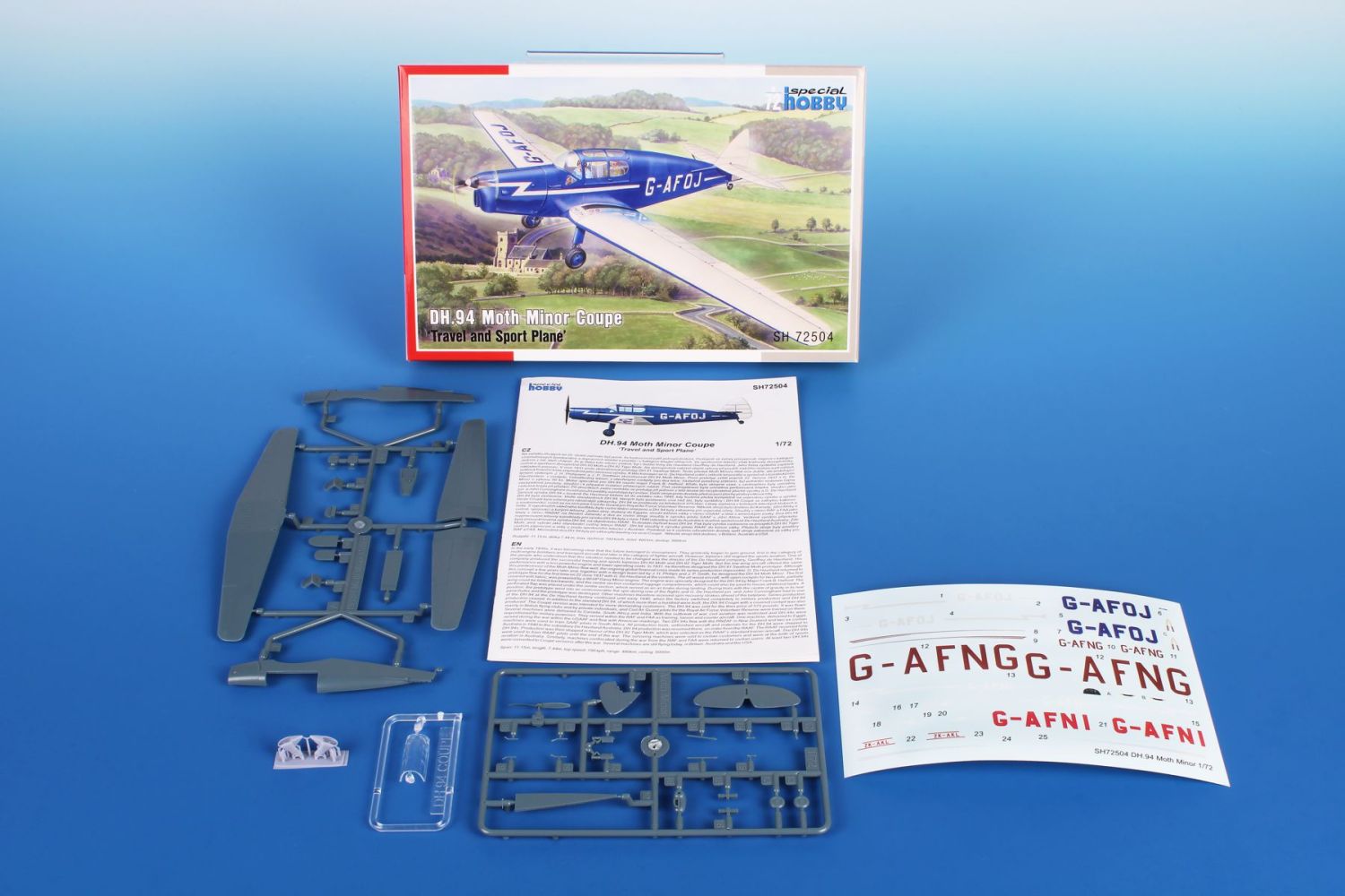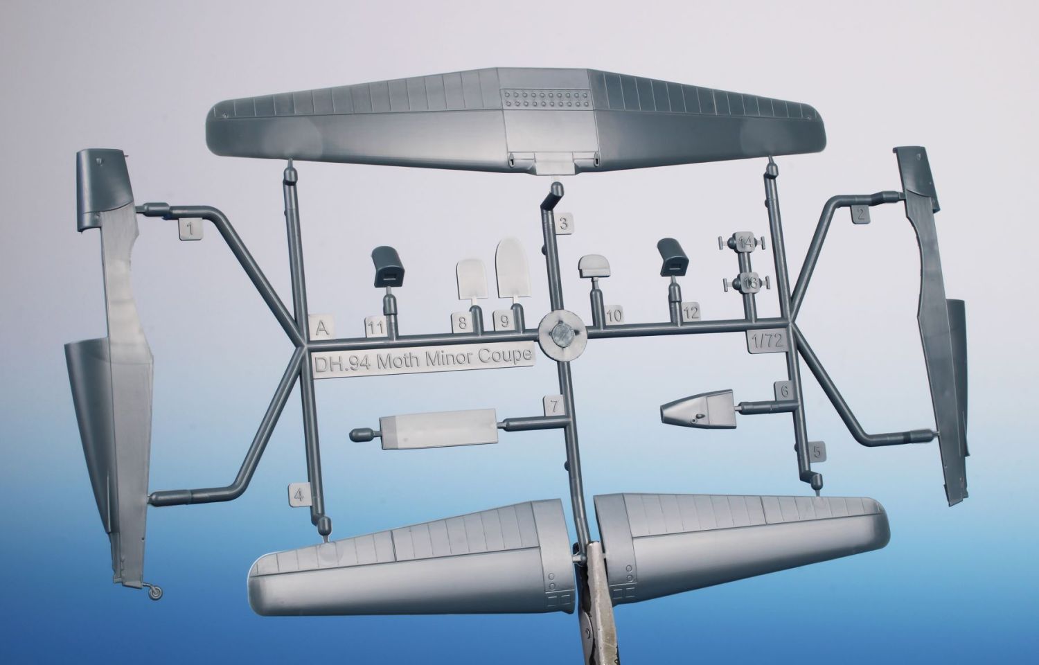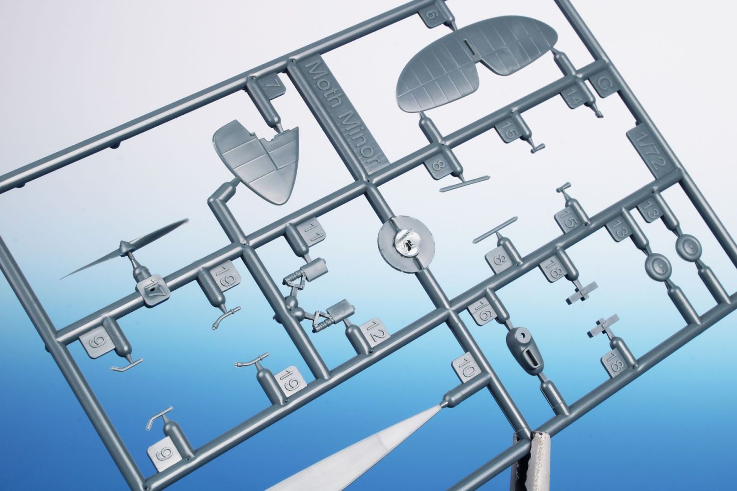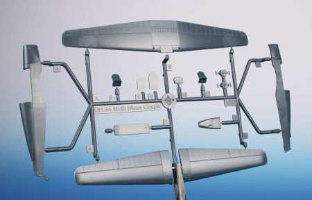 The Moth Minor kit consists of two sprues of plastic parts and a single sprue with a clear canopy. The decals feature three colourful civilian aircraft flying in the British Isles and one aircraft flying in New Zealand.