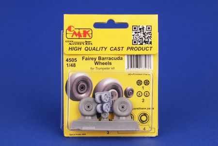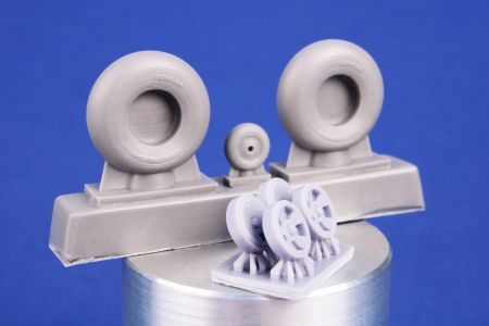 Finely detailed resin cast wheels with 3D-printed hubs, one plain and the other one with a cover. The set also offers the tailwheel.