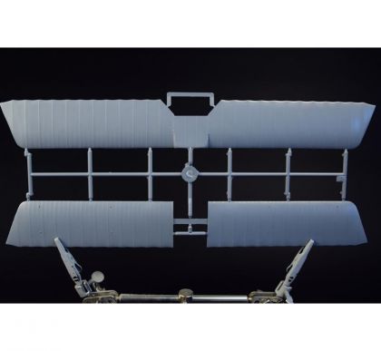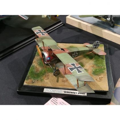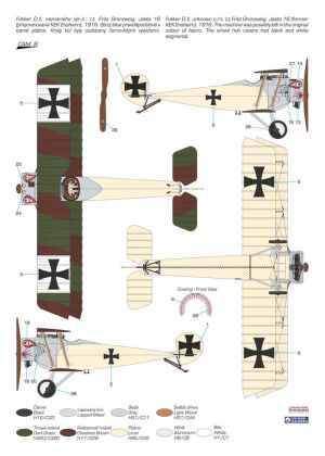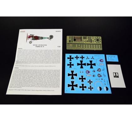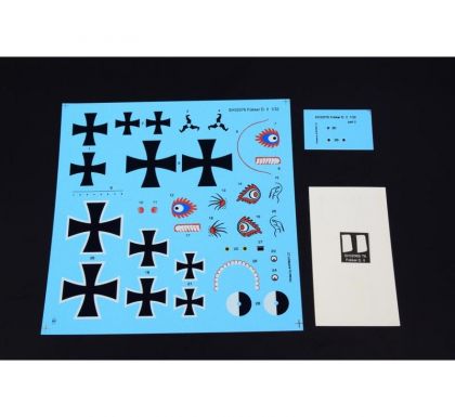 The kit contains three styrene sprues, two of them in short run standard, the third one is produced using metal moulds and brings the smallest items of the kit. A photo etched set and a windshield pre-printed on a piece of clear film are also offered in the kit. The decal sheet caters for two machines, both of which were flown by Lt.Fritz Grünzweig, a fighter pilot also renowned as an excellent painter, cartoonist and a buffoon. His machines were adorned with elaborated mouths and eyes on the cowlings and thus belonged to the most eye-catching of all Fokker D.IIs