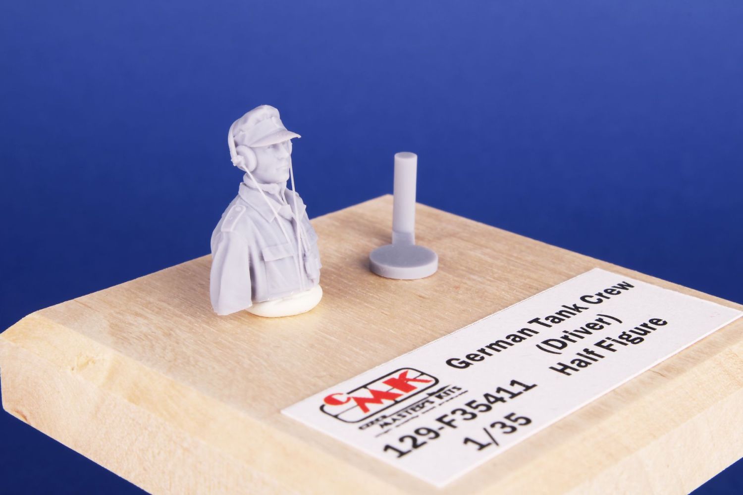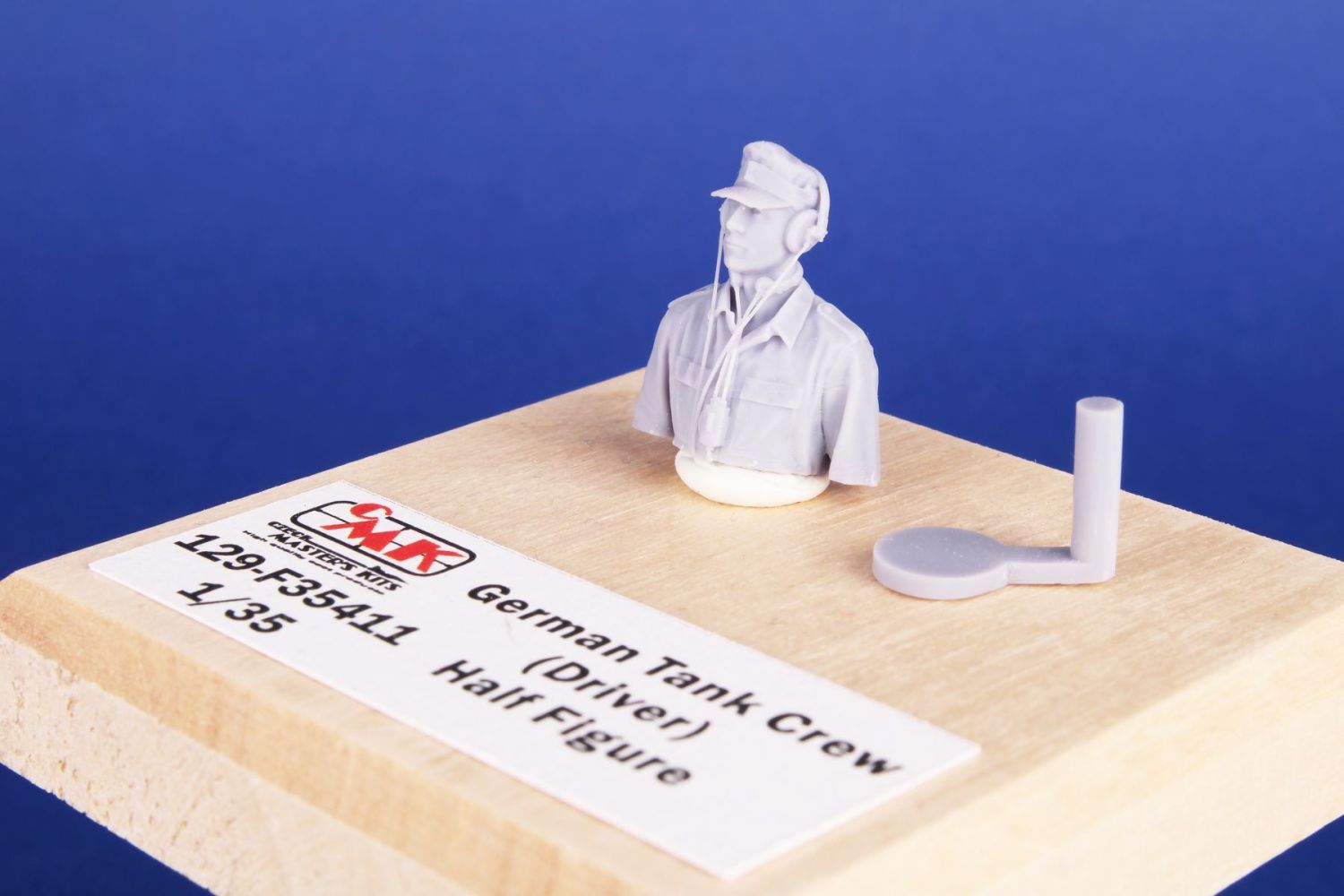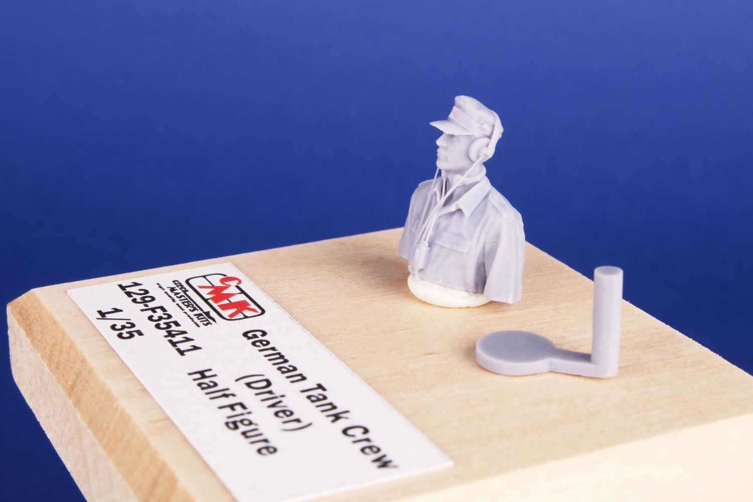 3D-printed and highly detailed half figure of a German tank driver that fits to an open crew compartment hatch.