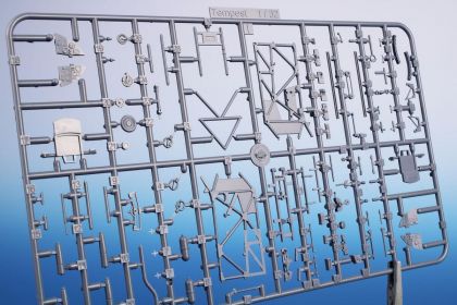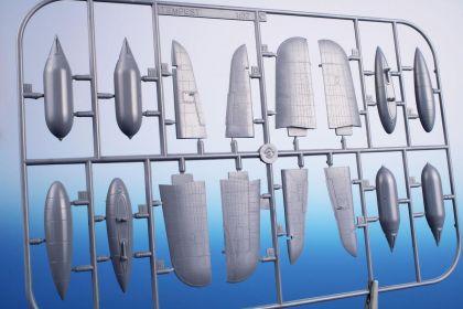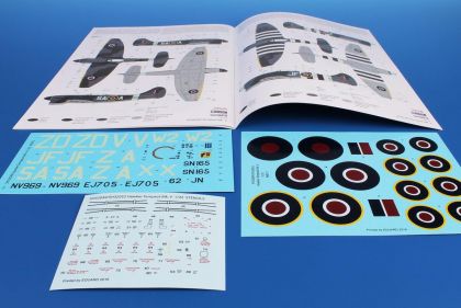 which is becoming almost sold out these days and now we would like to offer the modeller a basic version of the kit, which means it doesn´t contain the extra bonuses of resin (PUR) and photo-etched parts. The plastic parts come via as many as eight sprues of grey styrene and one clear plastic sprue and the surface throughout benefits from neatly engraved panel lines and rivet details. During the build, the modeller is guided by a highly detailed A4-size full colour instruction booklet. The decal sheets (there are three of them) and the camouflage option schemes offer in total four different machines. The Camouflage A represents NV969 / SA-A machine flown by Sqn.Ldr. Warren „Smokey“ Schrader, DFC and Bar (out of his total 12 kills he achieved 9 and ½ in the Tempest). Camo B offers JN862/JF-Z adorned with invasion ID stripes and it was a usual mount of F/Lt. Remy van Lierde, DFC and Bar, a Belgian in RAF service with 44 victories over V-1 missiles. The third camouflage option is EJ705/W2-X with a smart kangaroo artwork on the fuselage side and was flown by Australian Plt. Off. F.A. Lang . The camouflage scheme option D brings the modeller SN165/ZD-V machine, in which cockpit its pilot Sqn. Ldr. Emanuel Barnett Lyons, DFC experienced a rather arduous story with a fortunate ending. The decal sheets cater also for a complete set of stencils, including also items for the cockpit and the external fuel tanks.