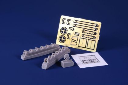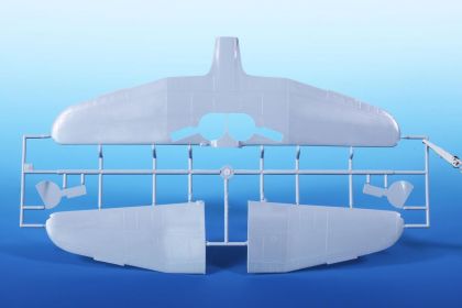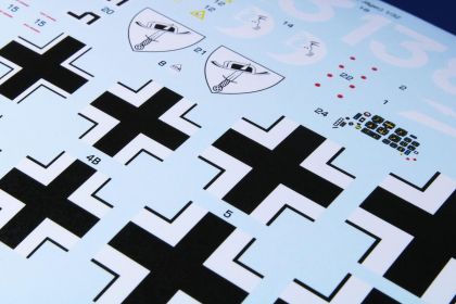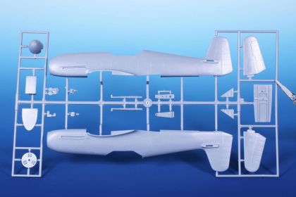 Our model comes on three styrene sprues. These are joined by a clear cockpit canopy, a fret of etches and a sheet of decals catering for markings of three fictious Luftwaffe units.