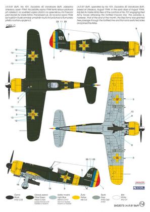 The Romania Air Force´s fighter and ground attack units were equipped with the I.A.R.80/81 type right from the beginning of the country´s involvement in the Second World War and until the end of hostilities. Fifty I.A.R.80s were in service during the attack against the Soviet Union on 22 June 1941. The 6th Group (61st and 62nd squadrons) and the 8th Group (41st and 60th Squadrons) were engaged at Stalingrad front during the autumn of 1942. 1 August 1943 saw I.A.R.80 & 81s defending the Ploiesti oil plants from attack by USAAF B-24 Liberators, during ‘Operation Tidal Wave’, when the Rumanian fighters downed some of the heavy bombers. On 10 June 1944, I.A.R.81Cs from 6th Fighter Group confronted P-38 Lightnings belonging to the USAAF 82nd and 1st FG (American pilots mistakenly reported having fought Fw 190As).