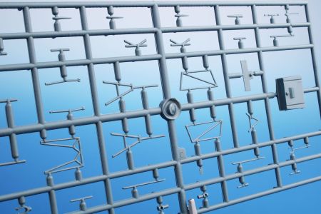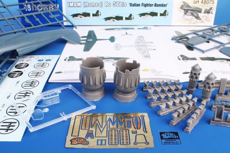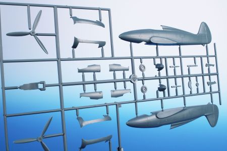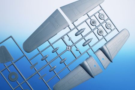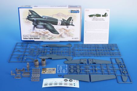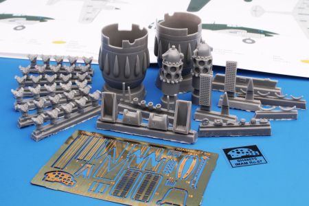 The kit consists of three sprues of plastic parts, and a sprue with clear parts. The plastic parts are supplemented with detailed resin parts and etches. The decals offer three machines in fighter-bomber configuration.