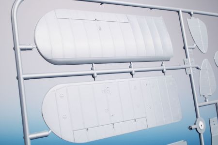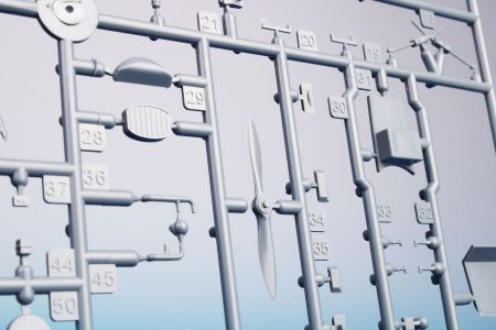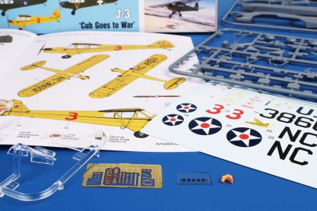 The model kit comes on two grey styrene sprues and one with the clear parts. The decal sheet offers markings for three airframes. The yellow one portrays a pre-war machine and is accompanied by two military machines. The first of these was an ex-civilian airplane wearing olive drab coat over the still partially visible yellow overall. The other military-flown machine is in the standard olive drab and neutral grey colours.