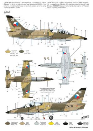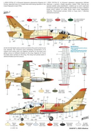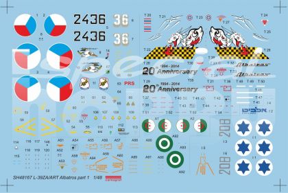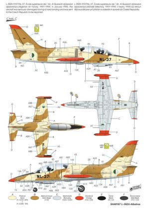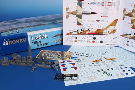 Kit no.SH48167 comes on three styrene sprues and contains also one clear sprue with the canopy which is split up into several sections and allows the modeller to display the canopy in open position. Resin parts and a set of photo-etches is also in the kit. The decal sheet has markings for one Thai L-39ZA/ART machine, a Czech L-39ZA in two various schemes and an Algerian L-39 which is depicted in three various schemes (the machine was overhauled at Aero following a hard landing). The final option brough via the decal sheet and camo schemes is a Czech machine as test-flown by Israeli pilots and wearing IAF markings.