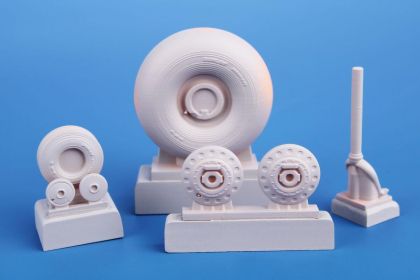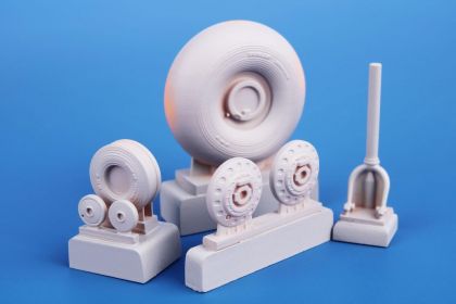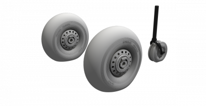 Finely detailed main undercarriage wheels with weighed tyres and hubs of war time design plus equally detailed tailwheel. For Lancaster bomber models of various producers.