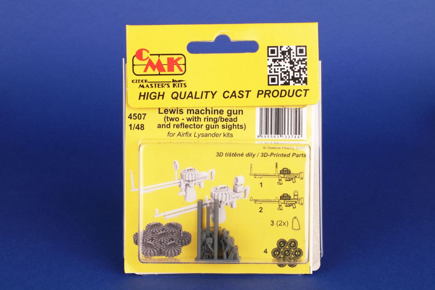 A 3D-printed set offering two machine guns, one with traditional ring and bead sights, the other with a reflector type sight. (Both types were used in the Lysanders.) The set also includes spare Lewis magazines, which were placed on a rotating platform, or a turntable in the Lysander fuselage.