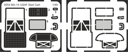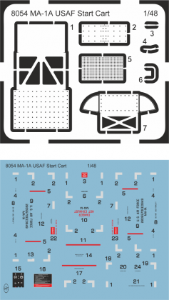 High pressure air starter unit used for starting an aircraft jet engine by means of high velocity air generated by a small turbine inside the cart. The MA-1A cart was in service since the 1950s and and was used to start number of US jet engine aircraft such as the T-33A, T-38 and many others, but could have been used with the huge C-130 turboprop as well. Set includes etching and decals.
