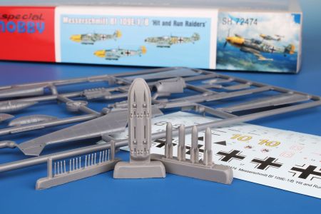 The kitset brings the excellent-looking styrene parts of the Bf 109E-1 version, topped with a 4xETC 50 bomb carrier with four bombs. The decals cater for three Luftwaffe scheme options, one as operated in Greece in 1941, the other two as flown against Britain in 1940.