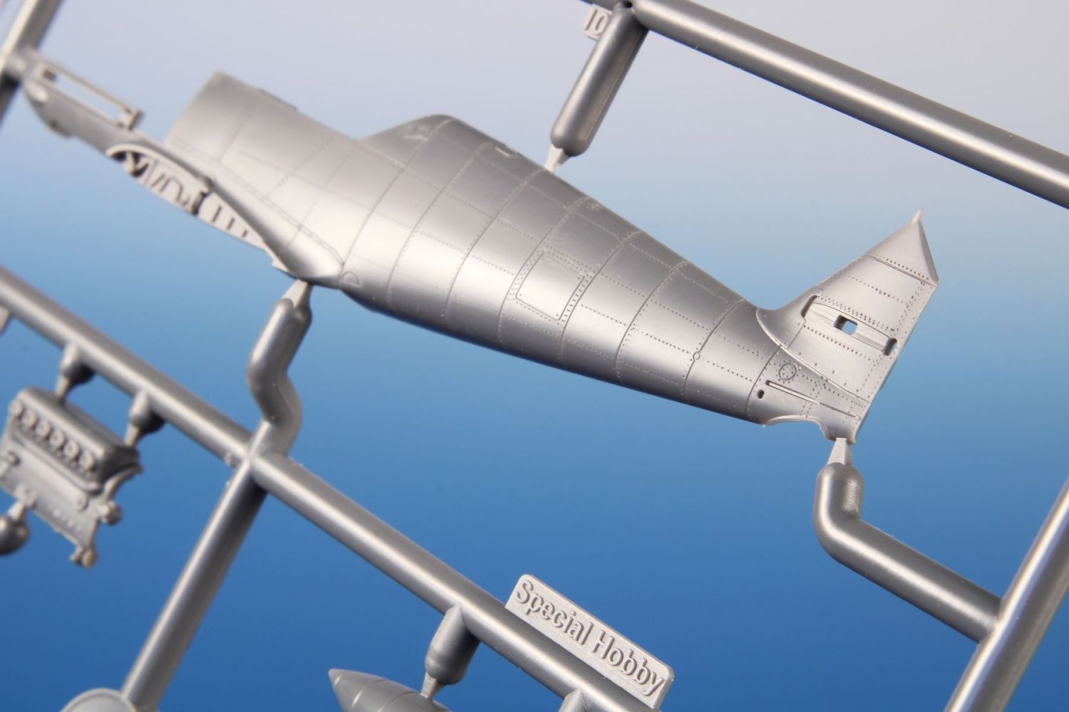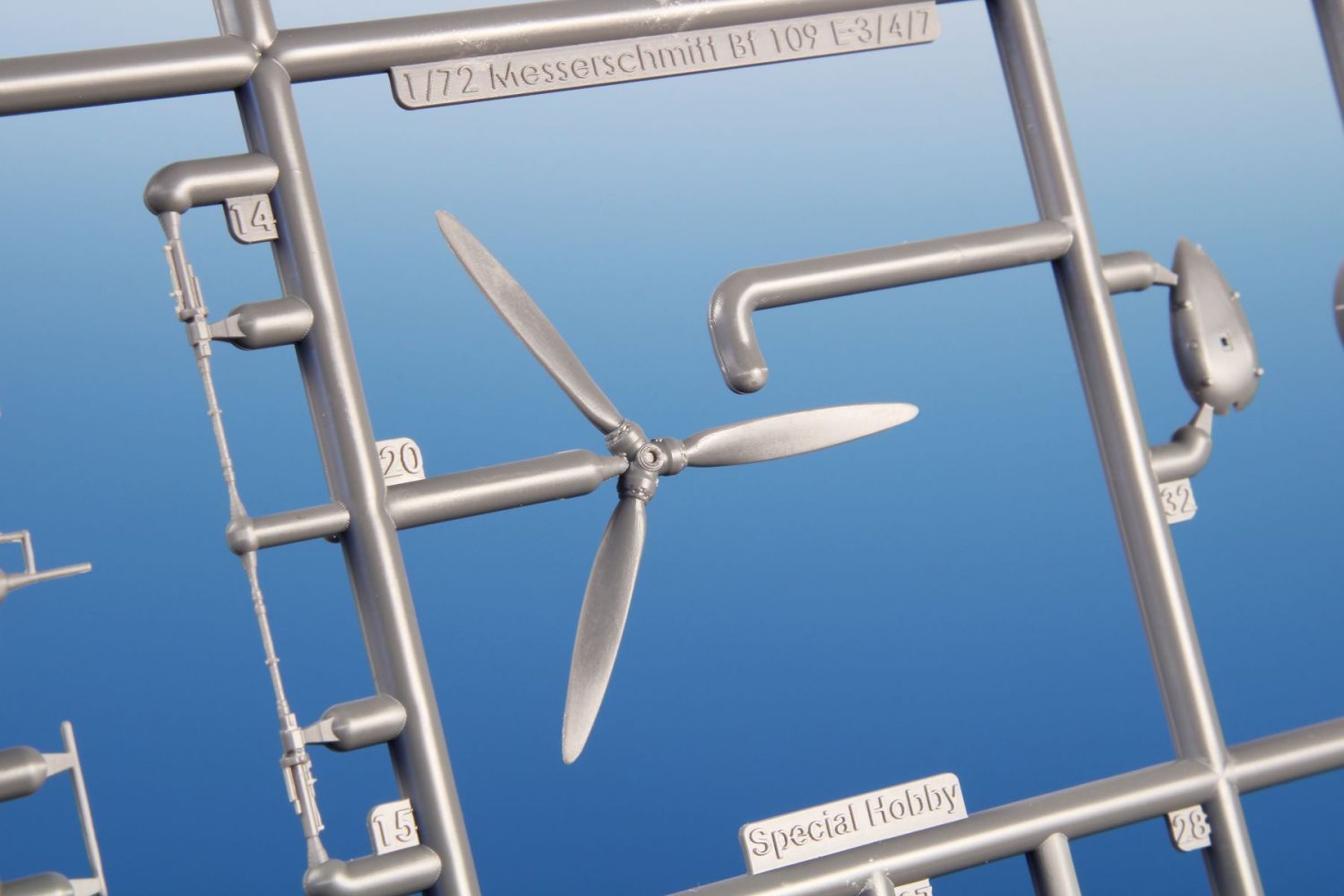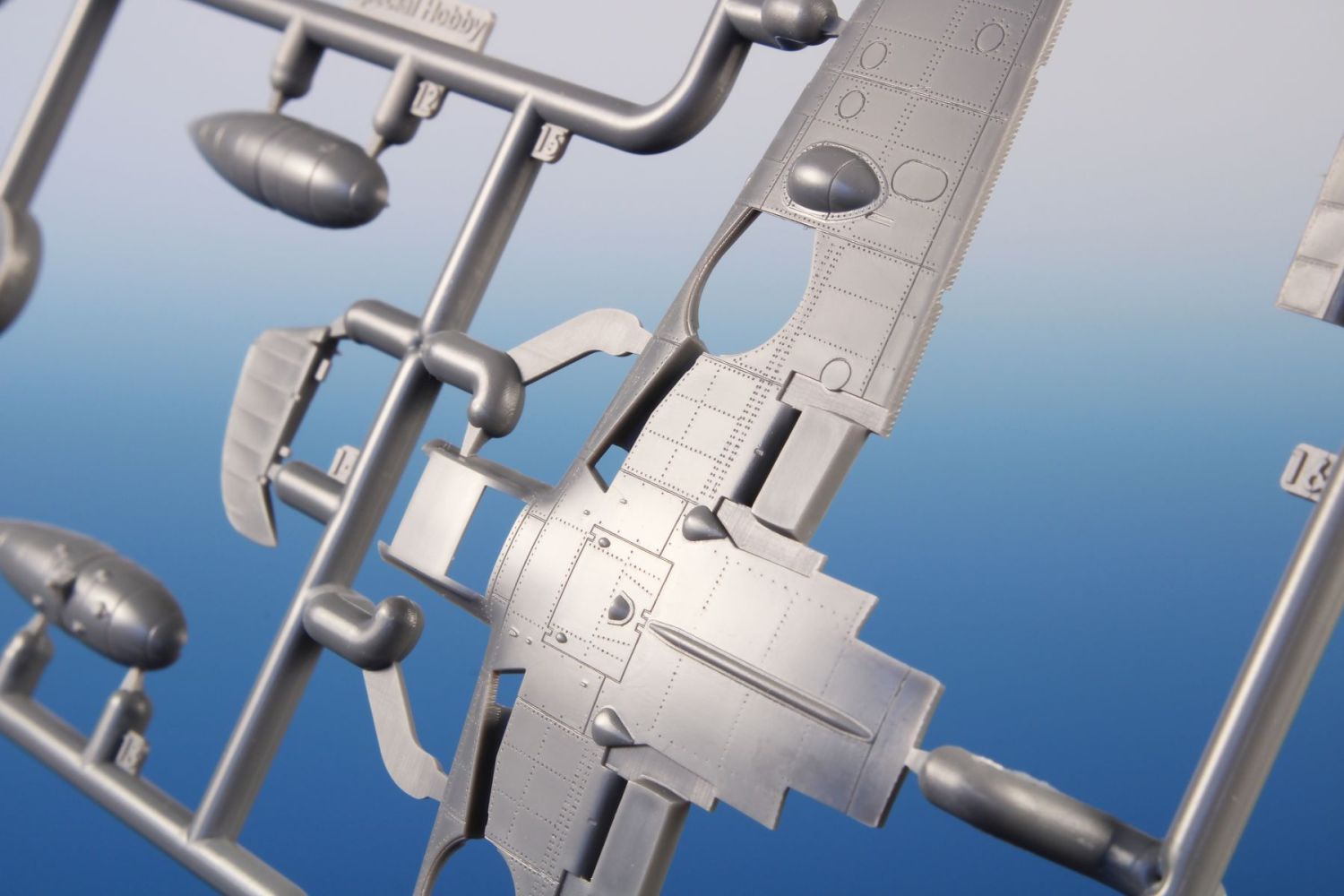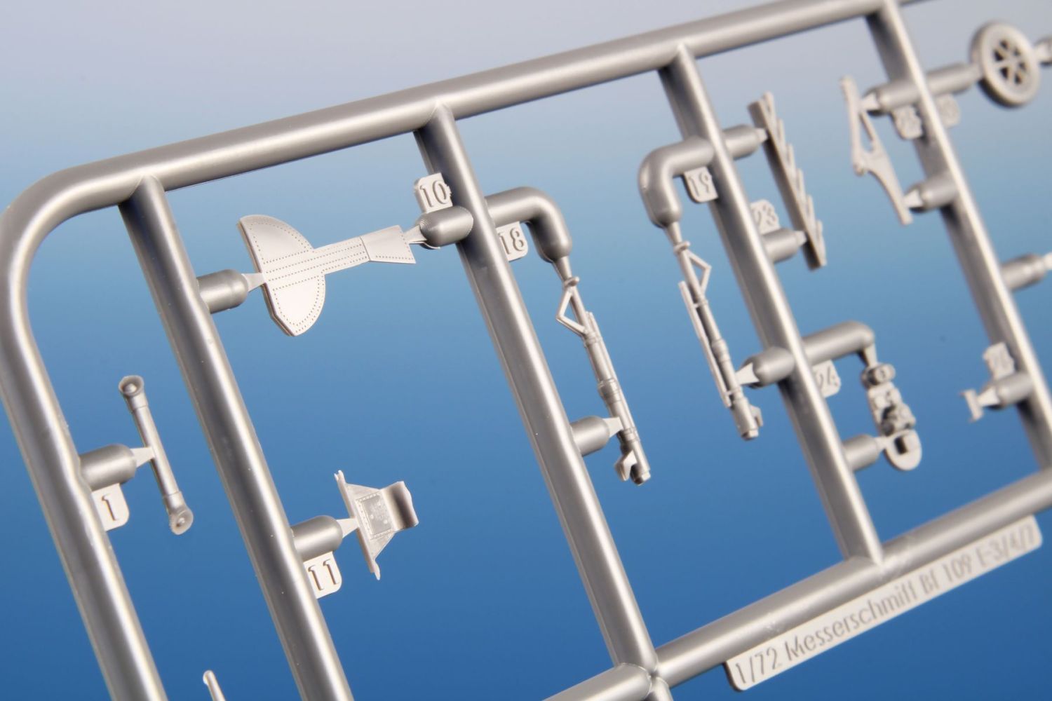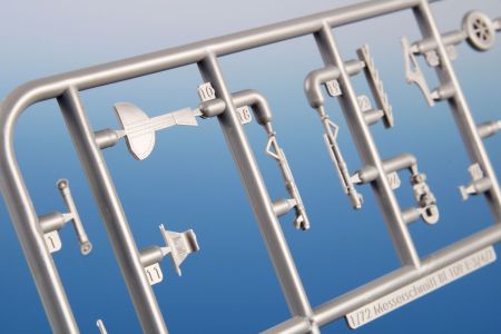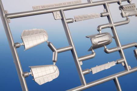 The model parts are broken up into two sprues of gray plastic and one sprue with clear parts. It is possible to build it with the engine and fuselage machine guns uncovered, with the flaps down and the slats extended. For the machine of Oblt. Herbert Ihlefeld, the kit also includes the ETC500 bomb rack and the SD 250 bomb.