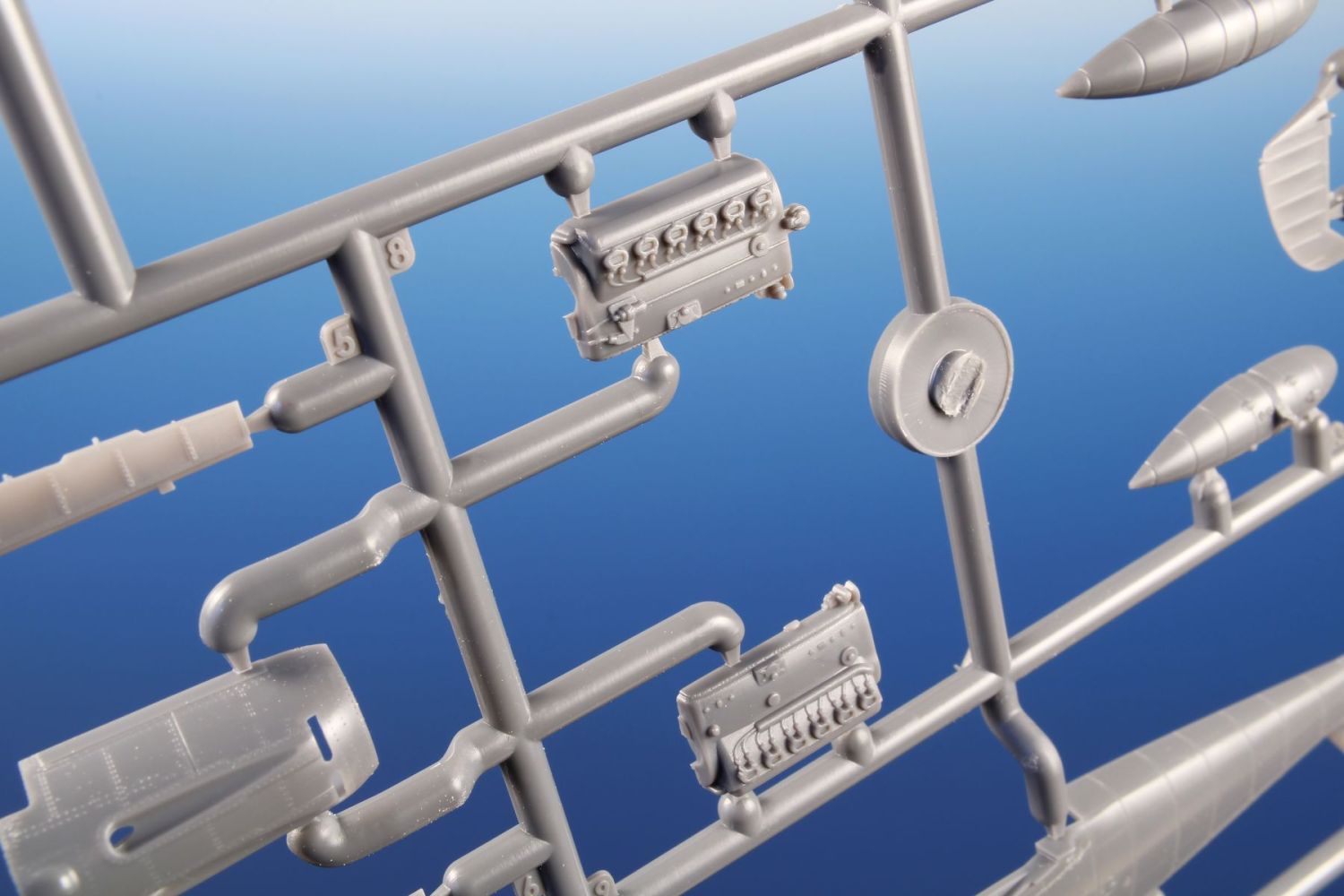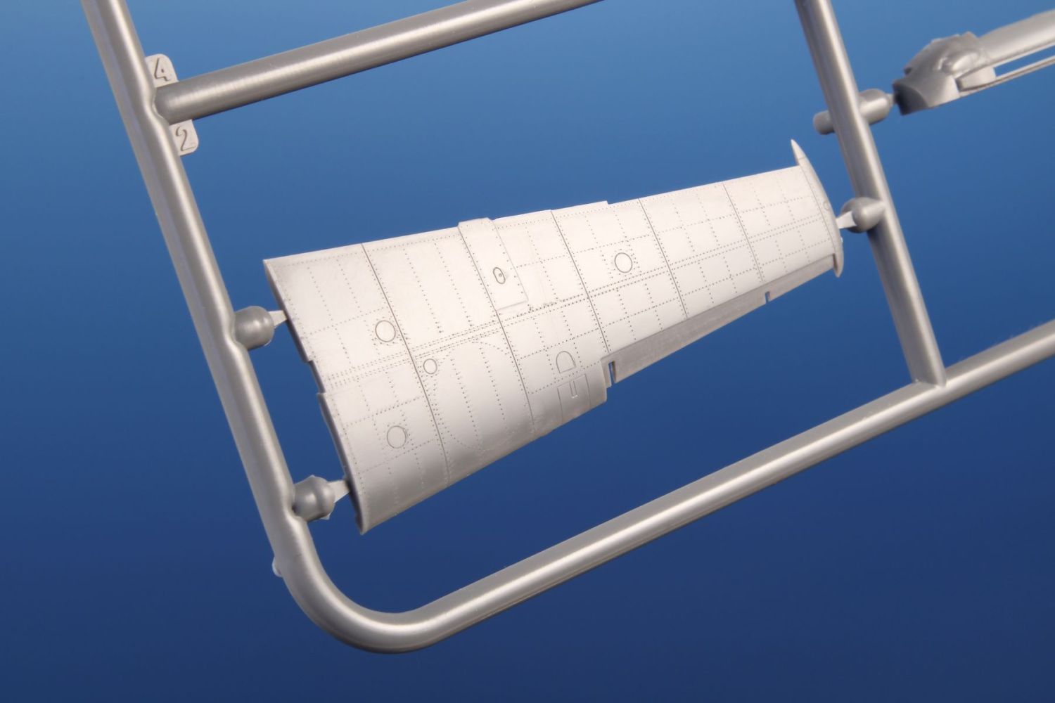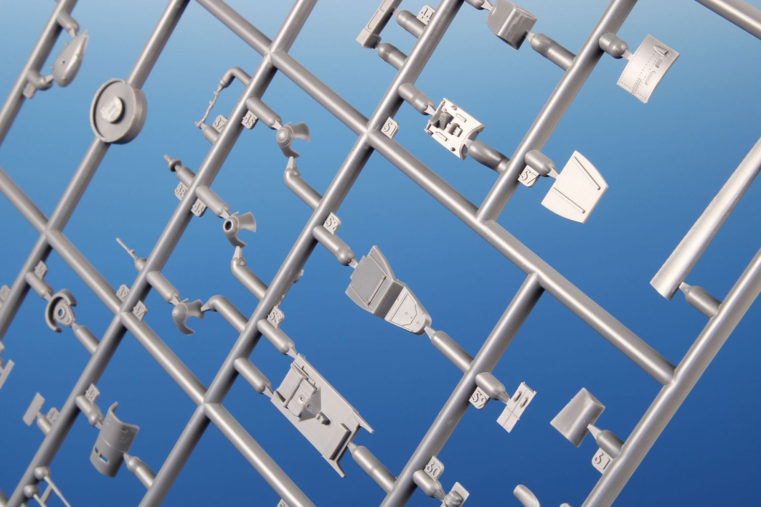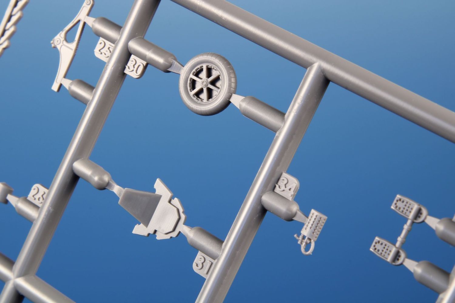 The model parts are broken up into two sprues of gray plastic and one sprue with clear parts. It is possible to build it with the engine and fuselage machine guns uncovered, with the flaps down and the slats extended. For the machine of Oblt. Herbert Ihlefeld, the kit also includes the ETC500 bomb rack and the SD 250 bomb.
