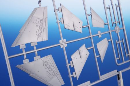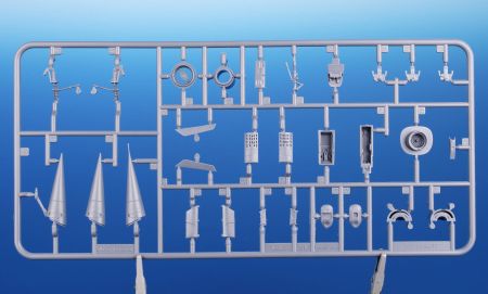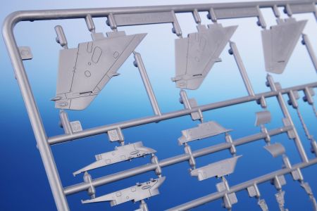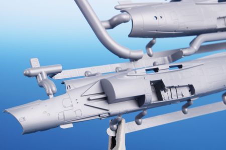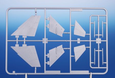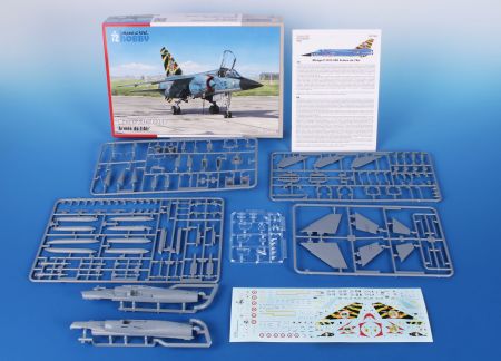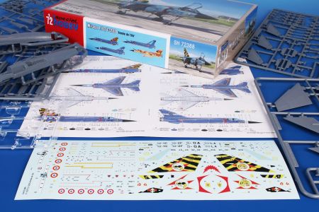 Our nicely detailed Mirage F.1C/C-200 model has its parts broken up to six grey styrene sprues plus one with clear parts. The decal sheet covers a quartet of machines, three of which sport grey-blue on the upper surfaces with aluminium paint below, they all carry various colourful trim and the fourth machine is in a desert scheme as it flew in Djibouti. Its centre-line fuel tank is adorned with a pair of eyes and a shark mouth.