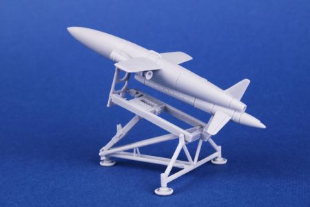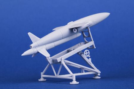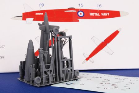Finely detailed, 3D-printed model of the Chukar target unmanned aerial vehicle, or a drone, that had been developed in the 1960s. To get to the air, the drone used a tripod launcher structure, either ground or vessel based. This tripod is also portrayed in our kit. The Chukars