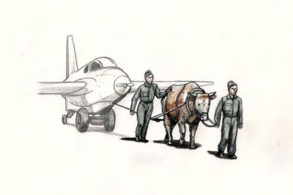 At the final stages of WW2, the Third Reich faced serious shortage of fuel and to save the maximum amount possible, draft animals were used for taxiing aircraft on airfields, too. Even the most advanced jet and rocket-powered military aircraft such as the Me 262 or Me 163 were often seen in 1945 being towed like a mere middle ages style ox cart.