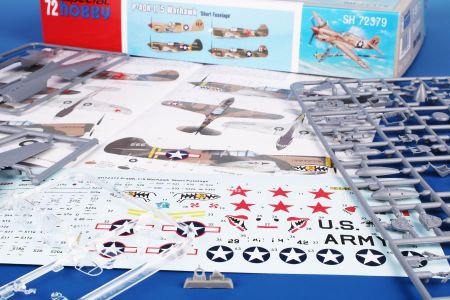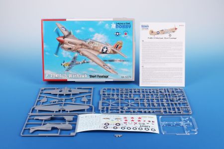 A US-built WW2 fighter aircraft in its short tail variety known as the P-40K-1/5 also featured a wider style tail fin. The kitset comes on three grey styrene sprues with another one with clear injected parts. Decal sheet also included with markings for four schemes:
