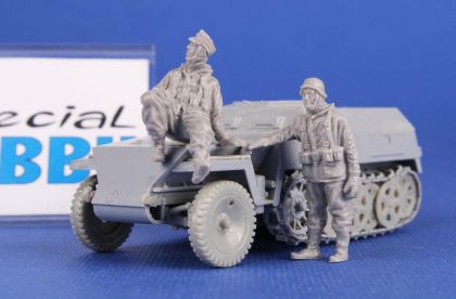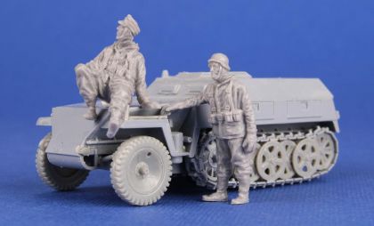 Two German soldier figures which add more life not just to our Special Armour range Sd.Kfz 250 kit (SA72019). One of the troop sits on the top of the vehicle armour while the other one stands beside.