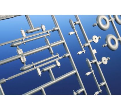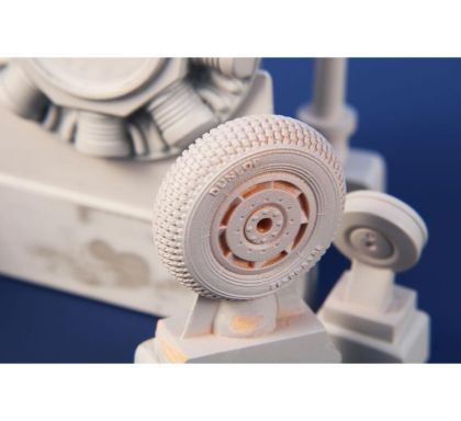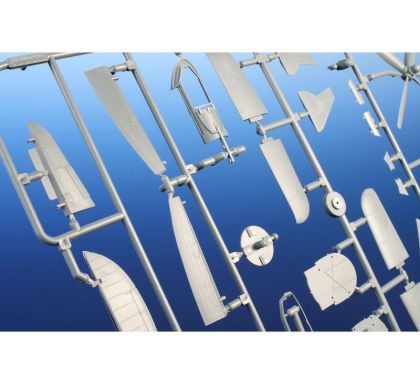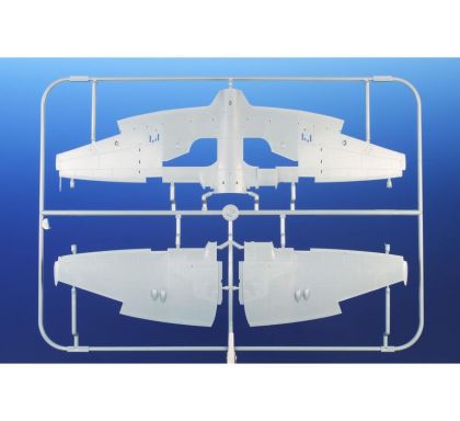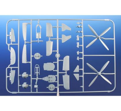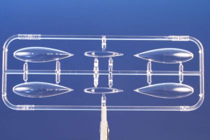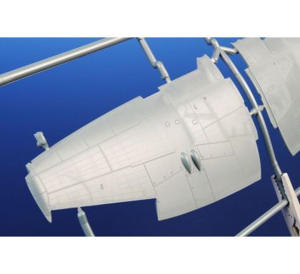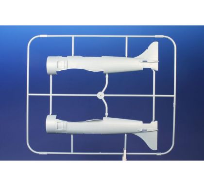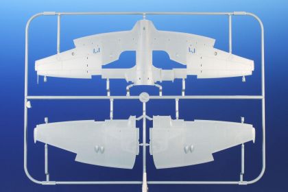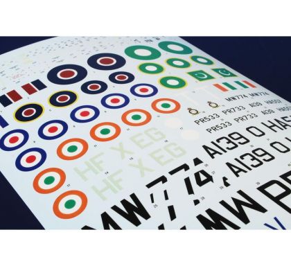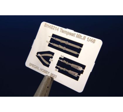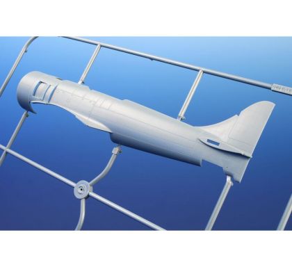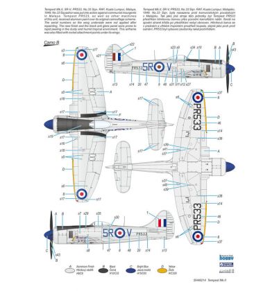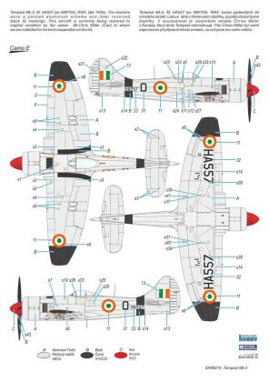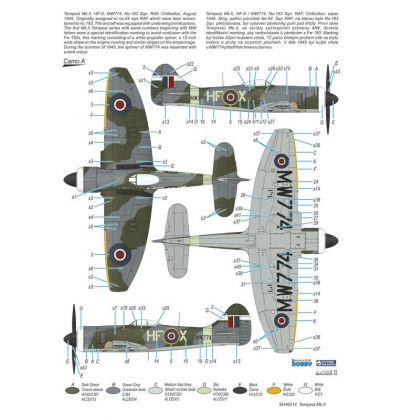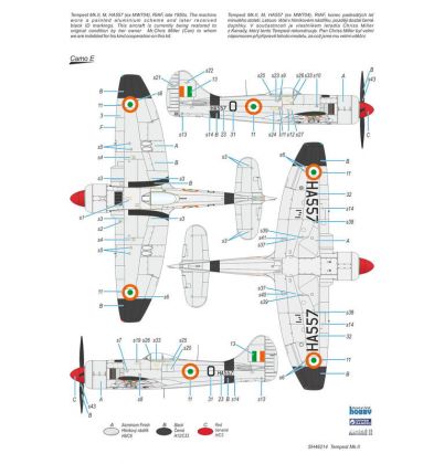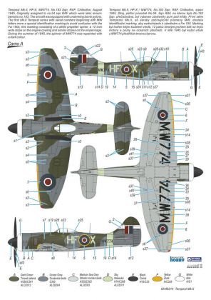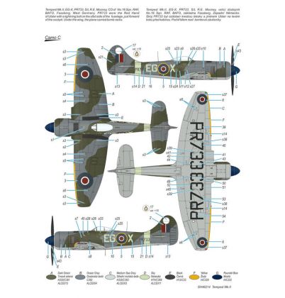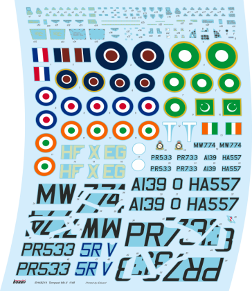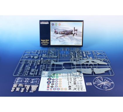 Our model of the Tempest Mk.II has been prepared in cooperation with Eduard. It contains eight styrene sprues including two clear parts sprues. The kit is topped up with a handful of resin items – resin undercarriage wheels, a partial replica of the engine with the covering panels, plus the necessary photo etches and painting masks. The decal sheet offers markings for five schemes – three as flown with the RAF, two of which are camouflaged and one in aluminium overall, then we have a Pakistani camouflaged machine and an Indian one in aluminium lacquer finish.