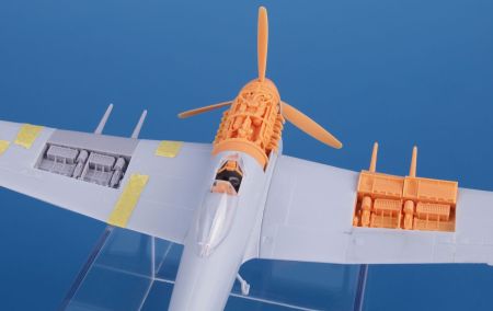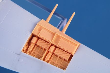 The Airfix Typhoon Mk.I kit offers the wing armament and ammo compartments open. Sadly, they are completely wrong and so also the wing cannon are placed in incorrect position. This set offers new ammo boxes and correctly positioned cannon breaches, covering panel with the right dimensions and also a new leading edge section of the wing so that the cannon barrels are allowed in the right place.