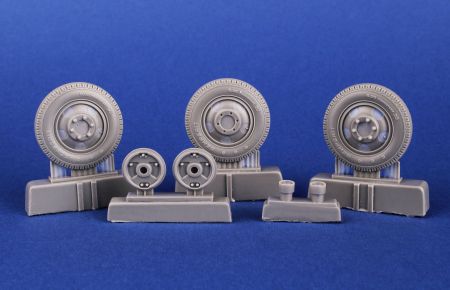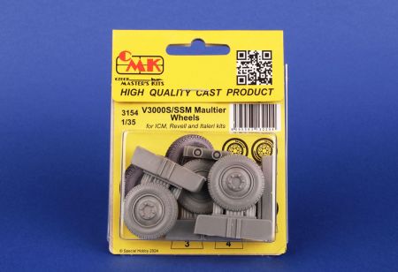 Finely detailed resin cast wheels for the front axle of ICM’s V3000S/SSM Maultier half track vehicle. Also for Revell’s reboxing.