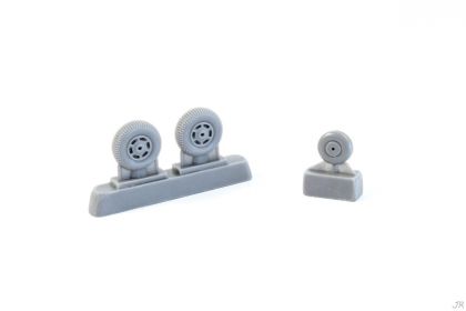 The set consits of a nose wheel and mainwheels with the later style hubs. These wheels are designed to fit single seat Vampire models from Special Hobby and Extratech or two-seater training Vampires from Aifix. The nosewheel comes as a one piece while the kit items have to be assembled from two parts. The mainwheel tyres feature nicely rendered and accurate tread pattern. The master parts were 3D created.