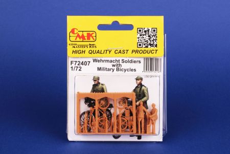 The same pair of soldiers as in the 1/48 set, now scaled down to 1/72 and 3D printed. A pair of German soldiers with military type bicycles and armament. One soldier rides his bike, the other one pushes it besides him. The armament carried on the bikes is quite varied, from a rifle to a pair of panzerfausts. All parts 3D-printed with superb detail levels.